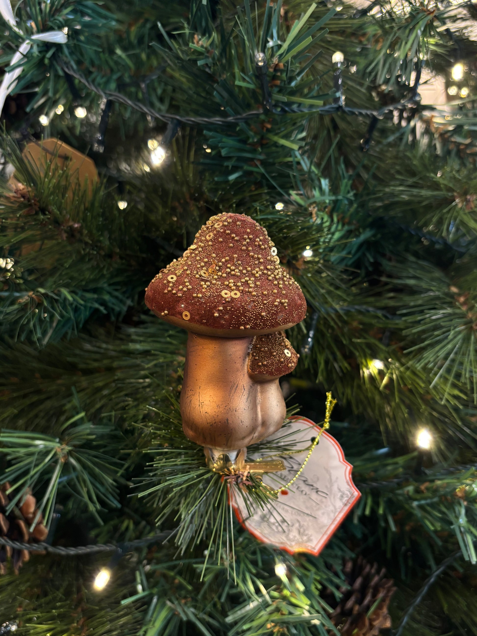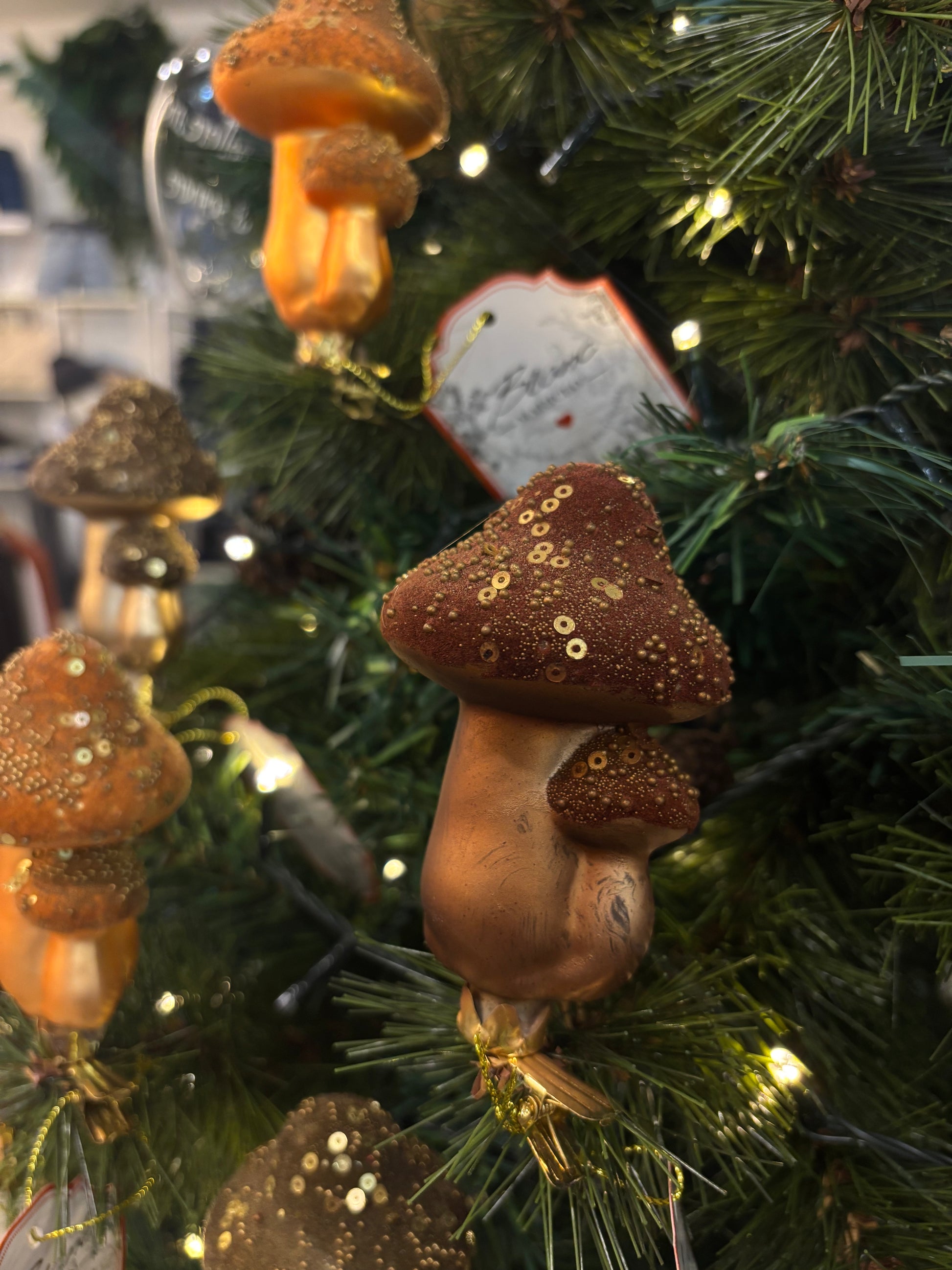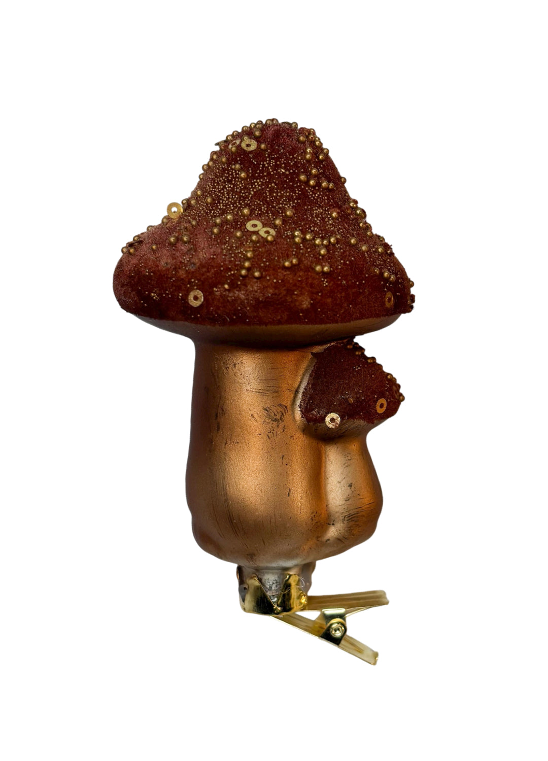Fungo decorativo in vetro soffiato dal tono marrone ramato, impreziosito da piccole perle e paillettes oro che donano un elegante effetto luminoso. Dotato di clip in metallo per un fissaggio semplice e stabile su rami, ghirlande o composizioni natalizie.