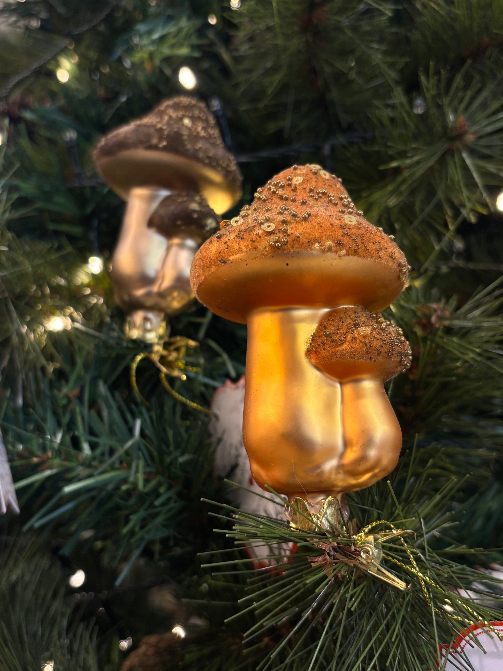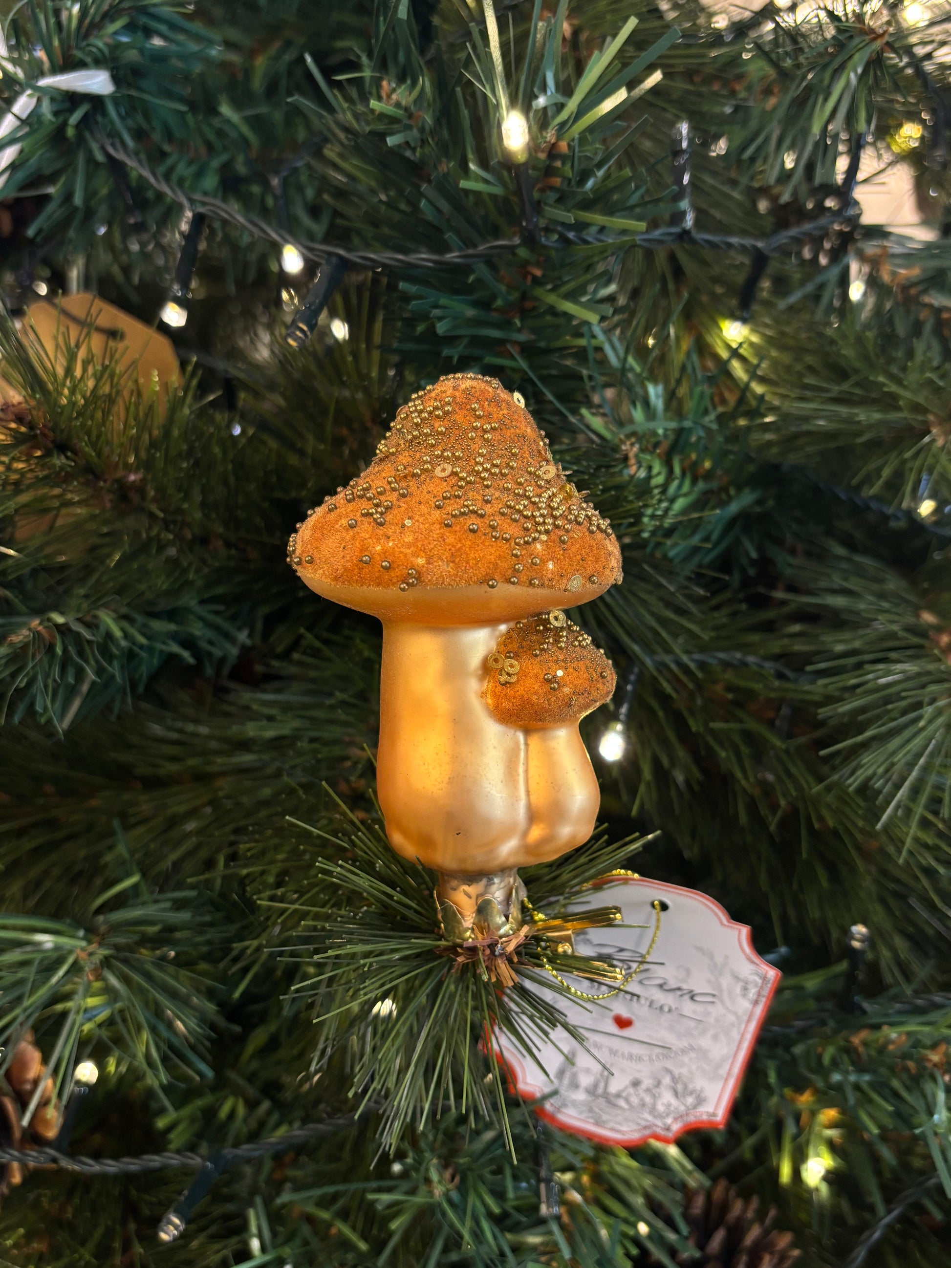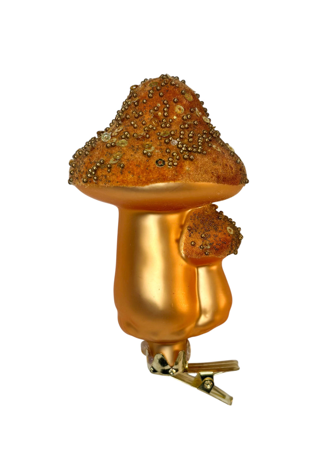 Fungo decorativo in vetro soffiato dal tono oro ambrato, impreziosito da piccole perle e paillettes dorate che creano un raffinato effetto luminoso. Dotato di clip in metallo per un fissaggio semplice e stabile su rami, ghirlande o composizioni natalizie.