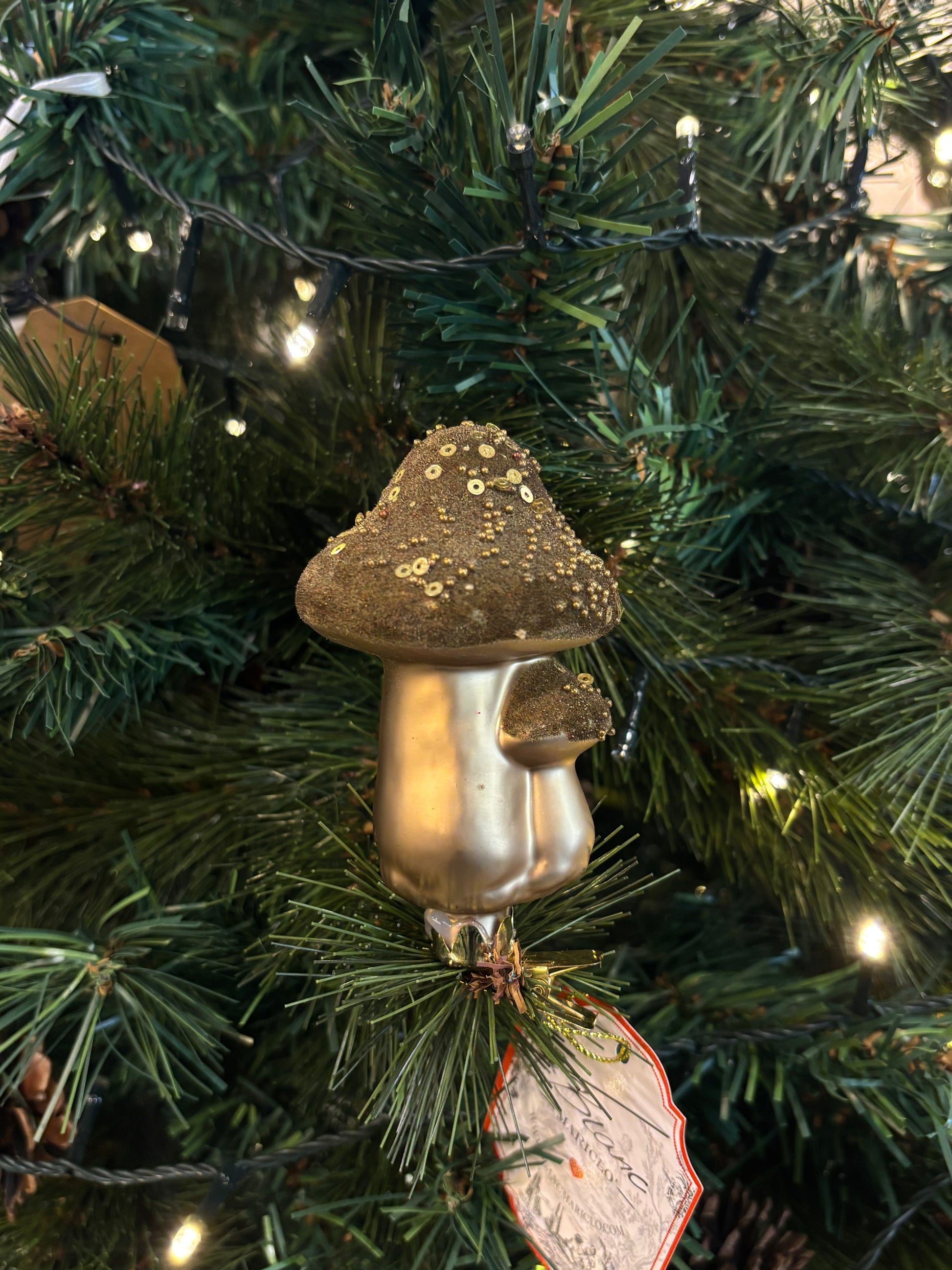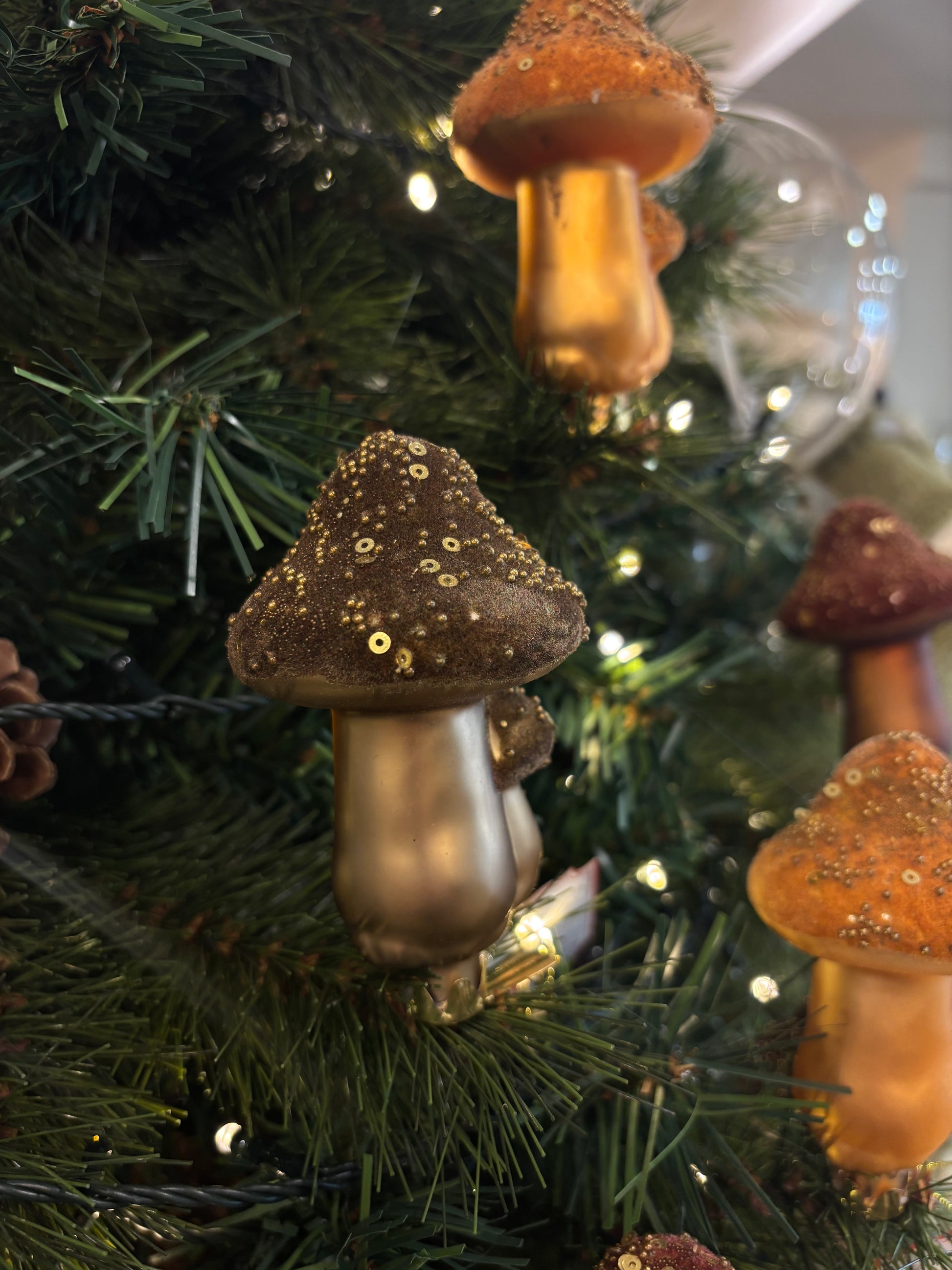 Fungo decorativo in vetro soffiato dal tono verde oliva scuro, impreziosito da piccole perle e paillettes oro che donano un elegante effetto luminoso. Dotato di clip in metallo per un fissaggio semplice e stabile su rami, ghirlande o composizioni natalizie.